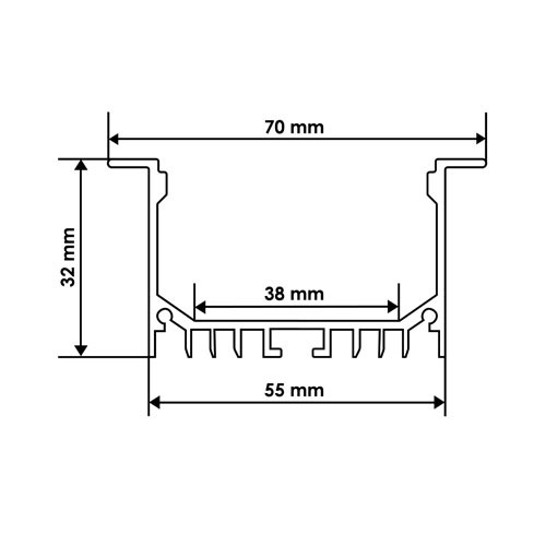 Внутрішня ширина 38 мм дозволяє вставити до трьох світлодіодних стрічок і отримати рівномірне світіння по всій площі лінзи профілю. Ширина частини профілю, яка безпосередньо врізається - 55 мм.